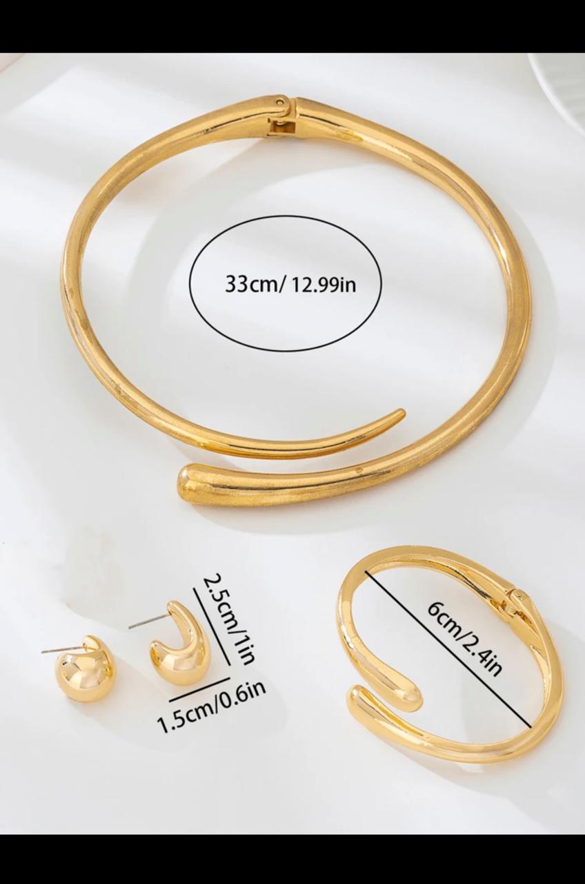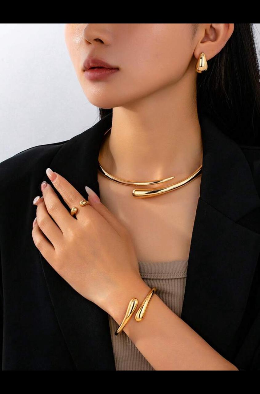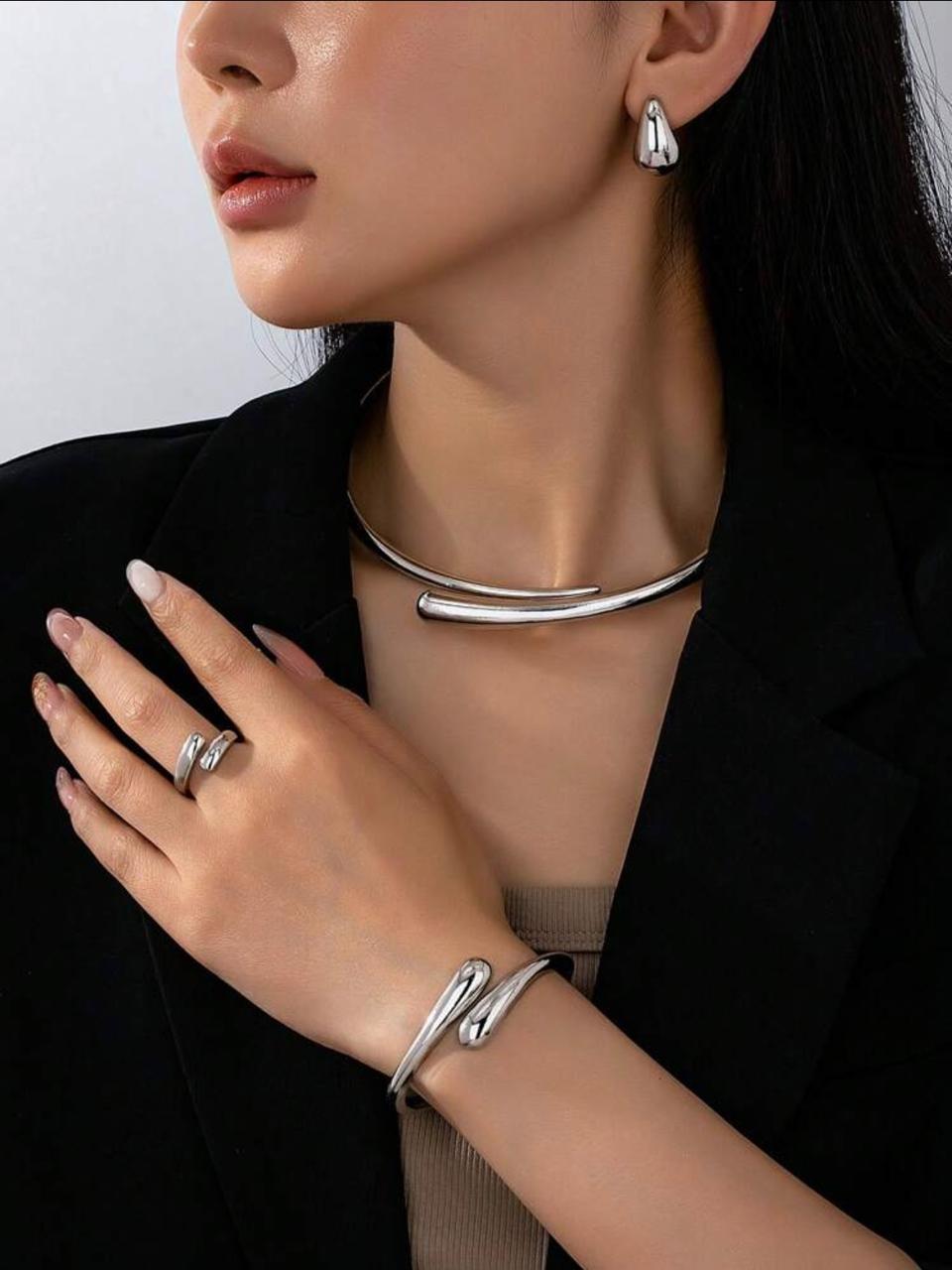 Turn heads with this elegant metallic geometric water drop jewelry set, designed to add sophistication and style to any occasion. Crafted from premium alloy with a glossy metallic finish, this set includes a bracelet, ring, necklace, and earrings, each featuring a modern geometric water drop design.