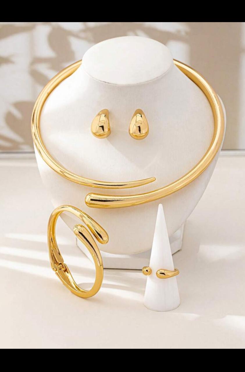 Elegant 4-piece metallic geometric jewelry set featuring a water drop design. Ideal for parties, galas, and special dates — a perfect gift for women.