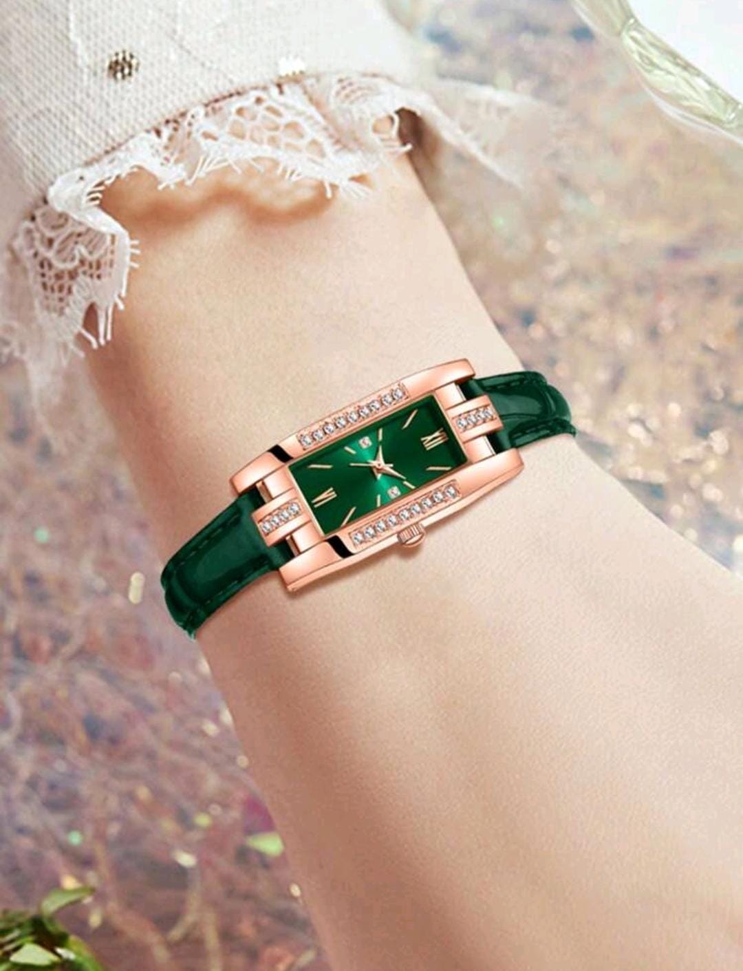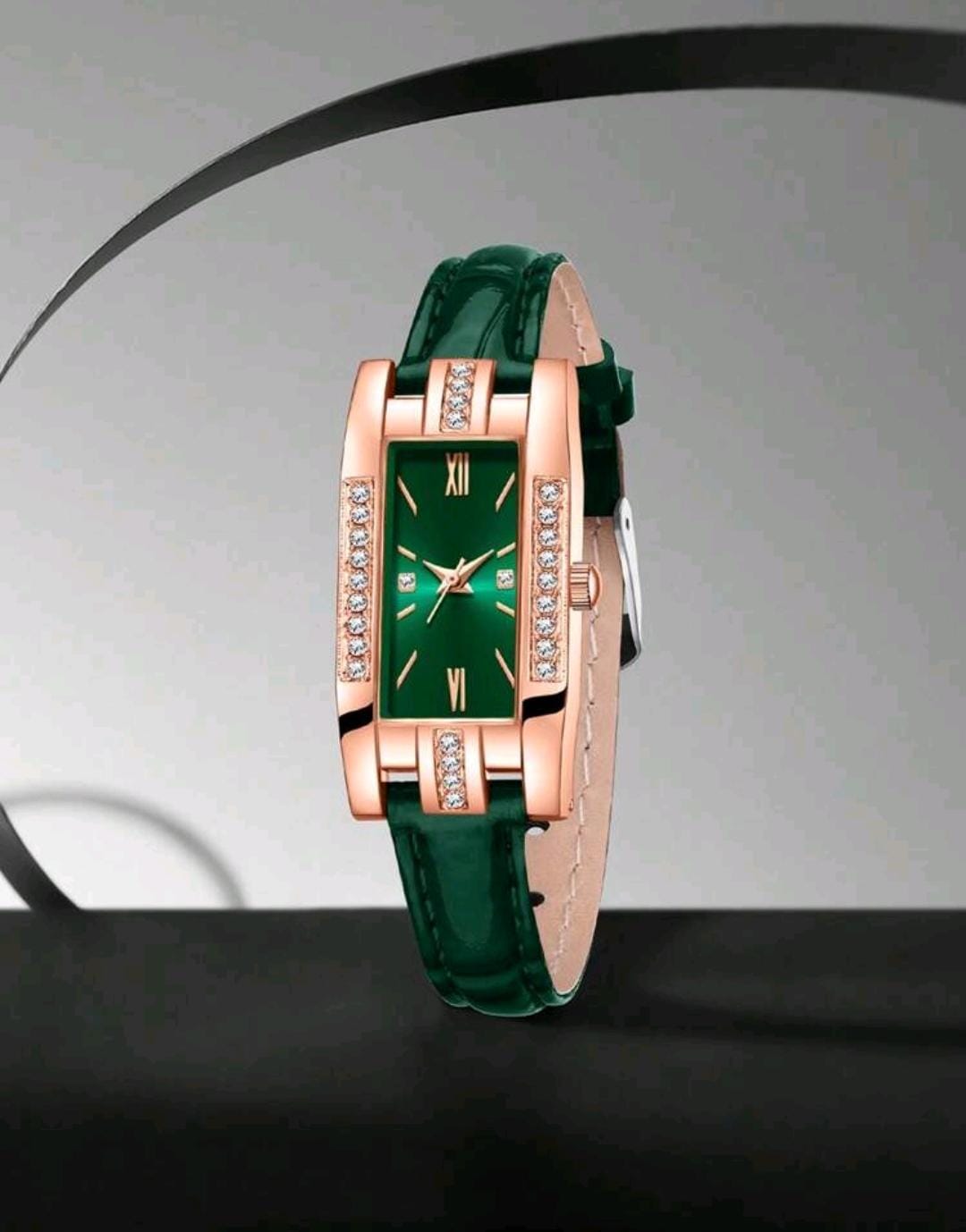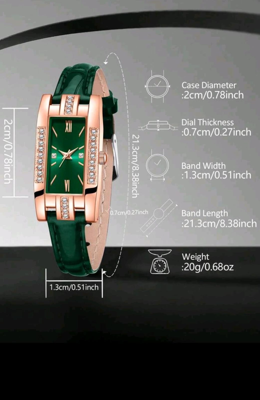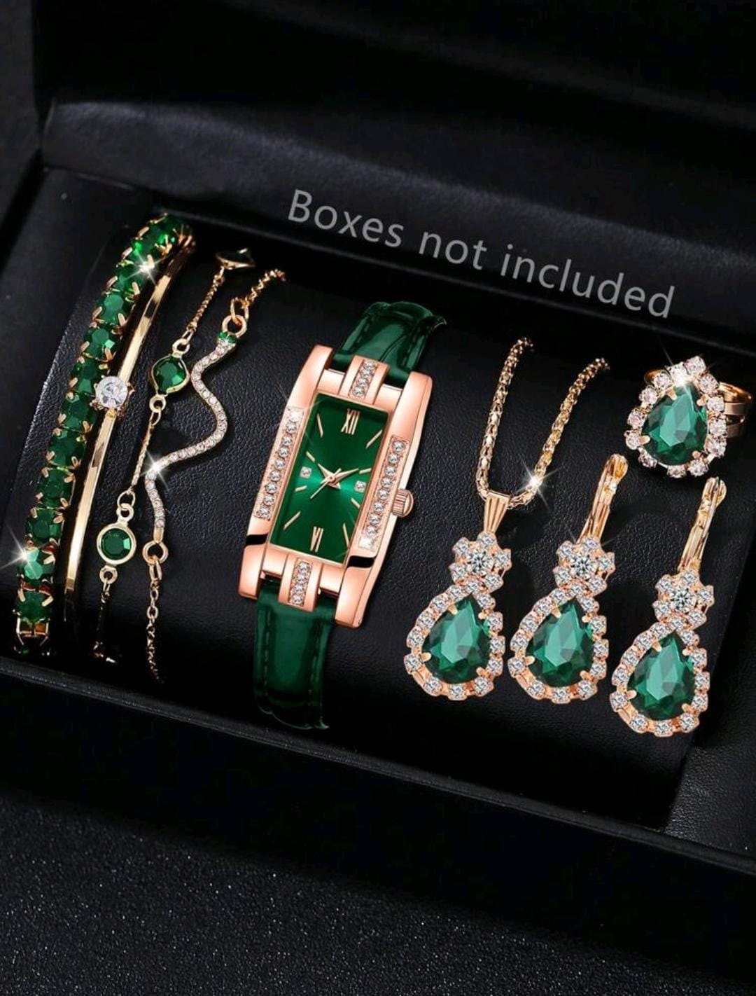 Step into elegance with this 9-piece luxury green women’s watch set, designed for those who love timeless fashion and coordinated style. Featuring a rectangular dial quartz watch paired with matching bracelets, necklace, and earrings, this set is the perfect blend of functionality and sophistication.